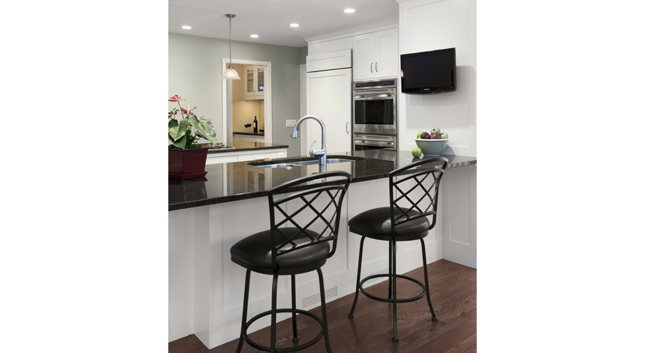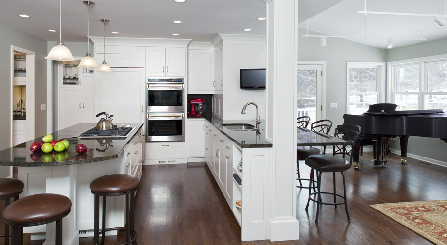 With a sun room addition to the east and the family room to the south, the kitchen became the hub of activity for this musical family. Guest seating throughout the entire first floor is perfect for dining, entertaining, and family concerts.