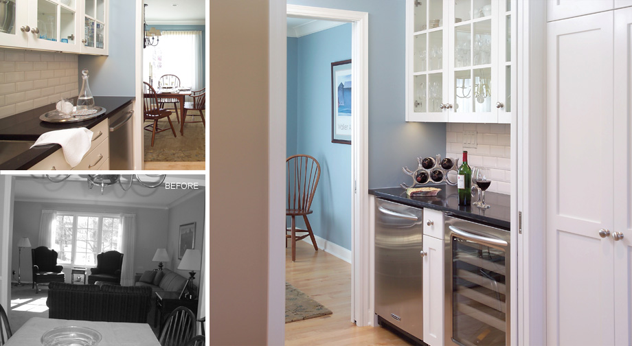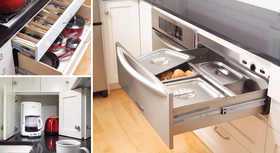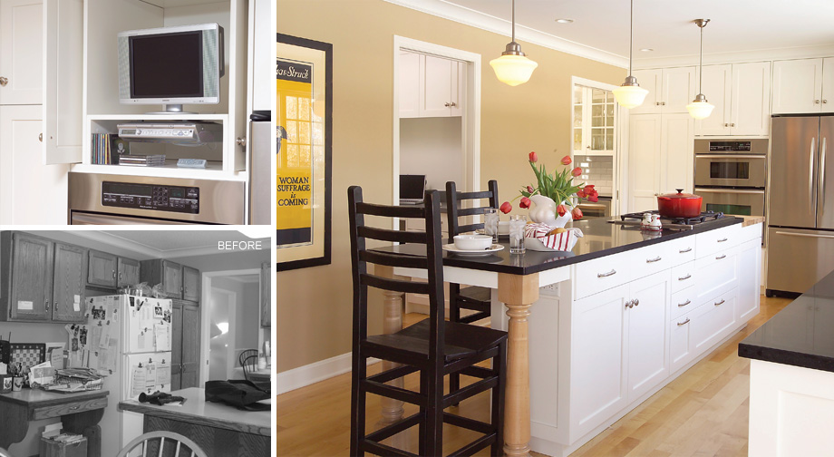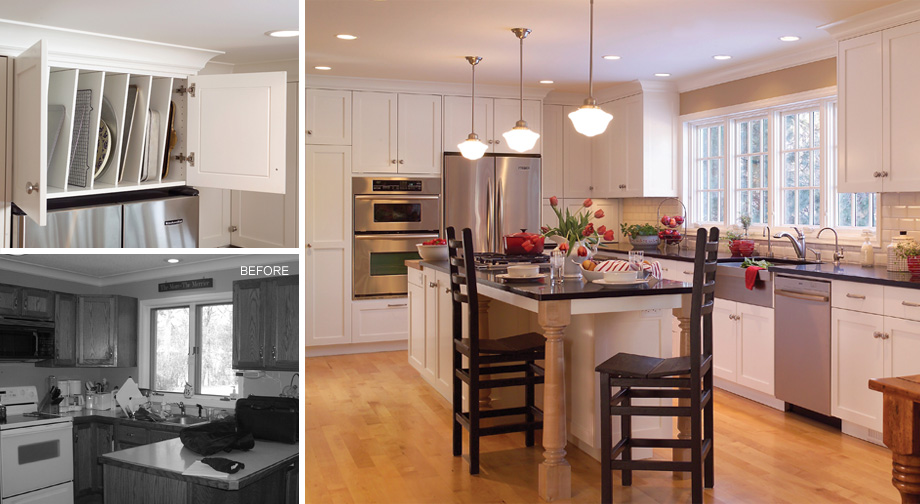 Tall, white cabinets with detailed interiors brighten up this large kitchen and make every inch both functional and beautiful. A custom "command center" puts all the family scheduling and planning needs in one convenient place.